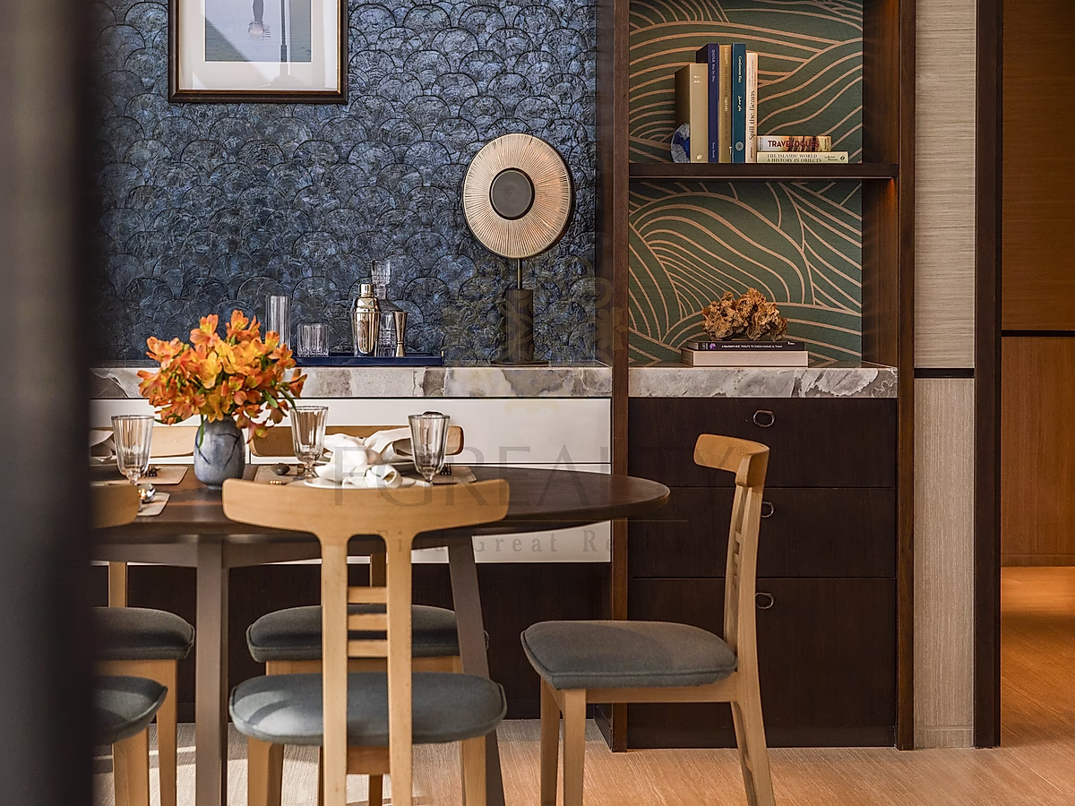 تضم الشقة غرفة نوم رئيسية واسعة بحمام خاص يحتوي على مغسلتين، دش مطري، حوض استحمام، وغرفة ملابس. كما تشمل صالة مفتوحة متصلة بمطبخ حديث مجهز بأجهزة SMEG، ماكينة نسبريسو، ثلاجة مشروبات فاخرة، ومنطقة طعام تتسع لأربعة أشخاص. وتزيد دورة مياه الضيوف وخزانة الغسيل من سهولة الحياة اليومية.