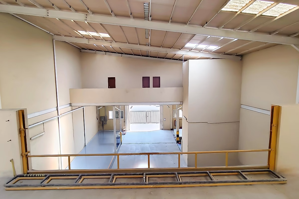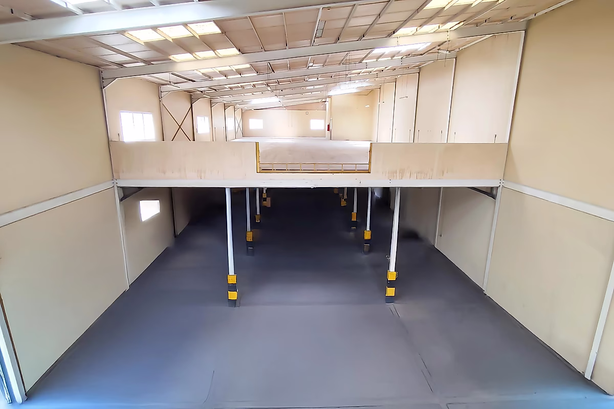 مساحة داخلية واسعة: مساحة واسعة مع طابق نصفي لتلبية جميع احتياجاتك التخزينية والتشغيلية.