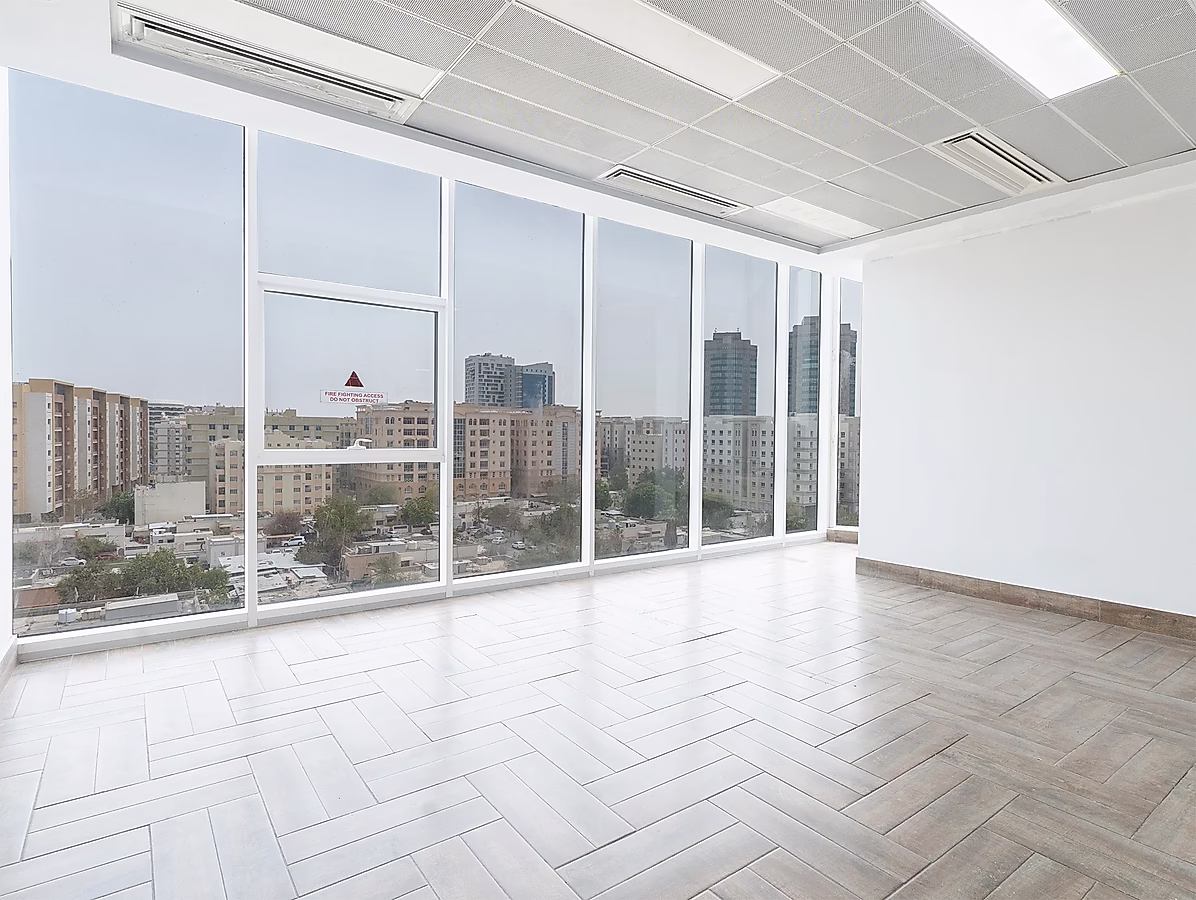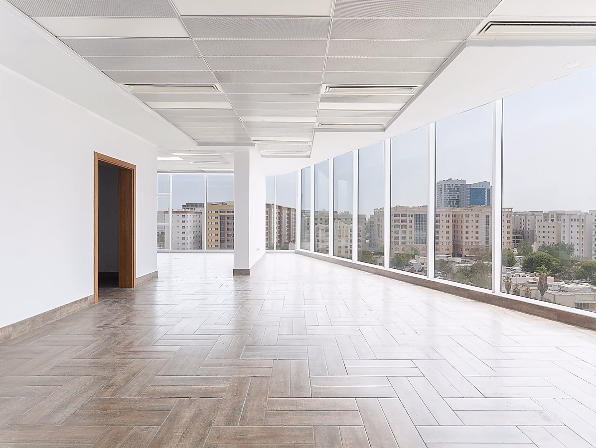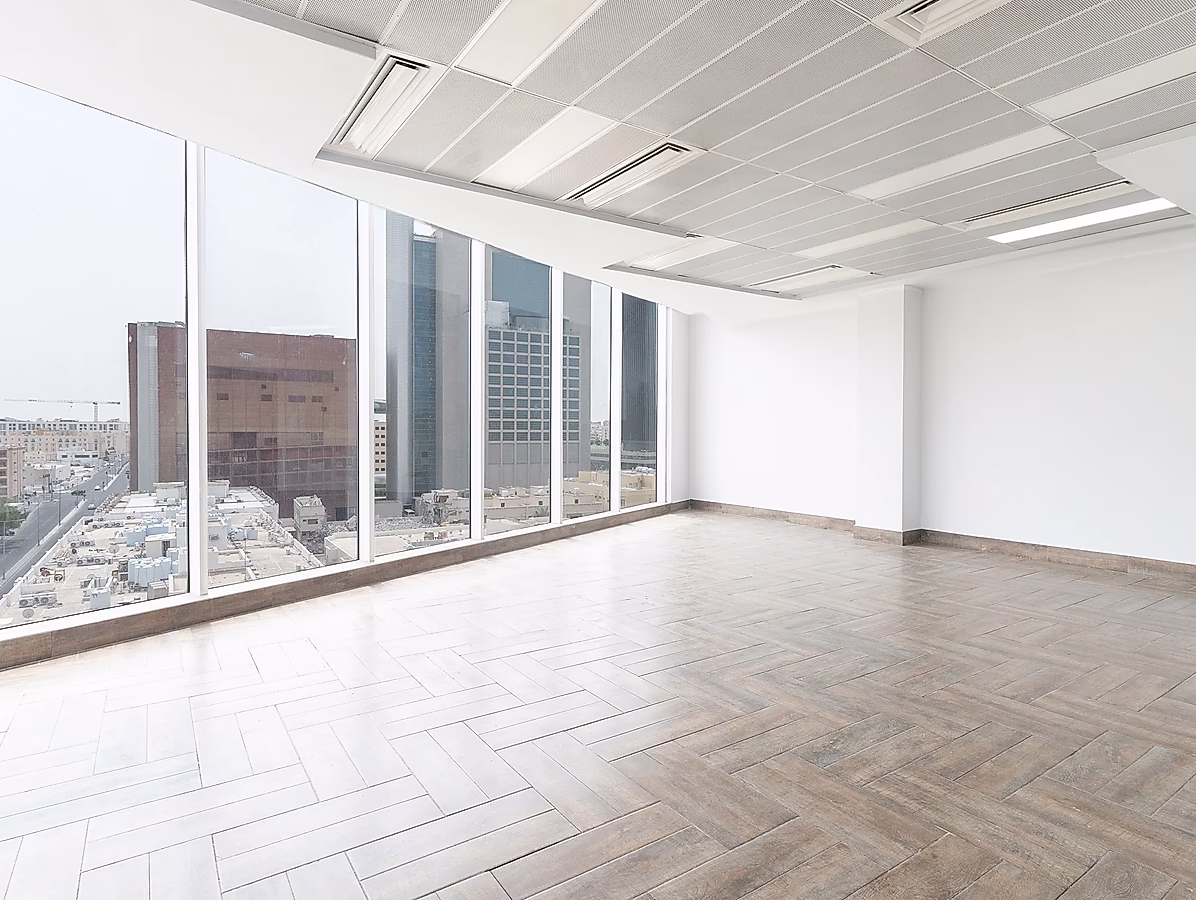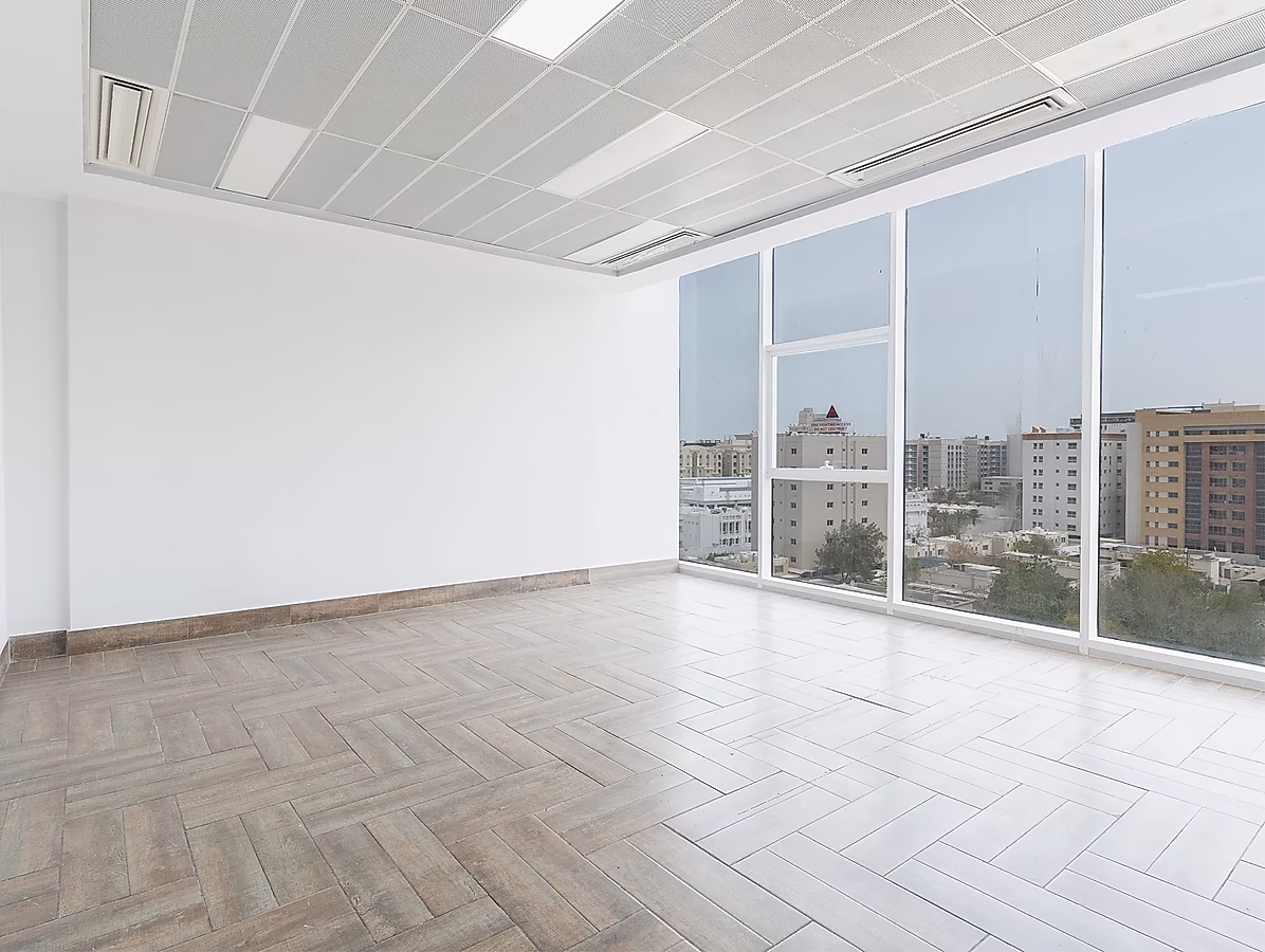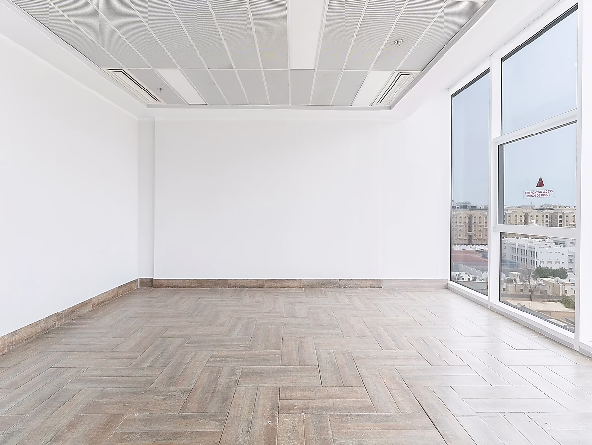 مشرق وجيد التهوية: تسمح النوافذ الكبيرة بالكثير من الضوء الطبيعي لغمر المساحة، مما يخلق جوًا مشرقًا وجذابًا يساعد على الإنتاجية والرفاهية.