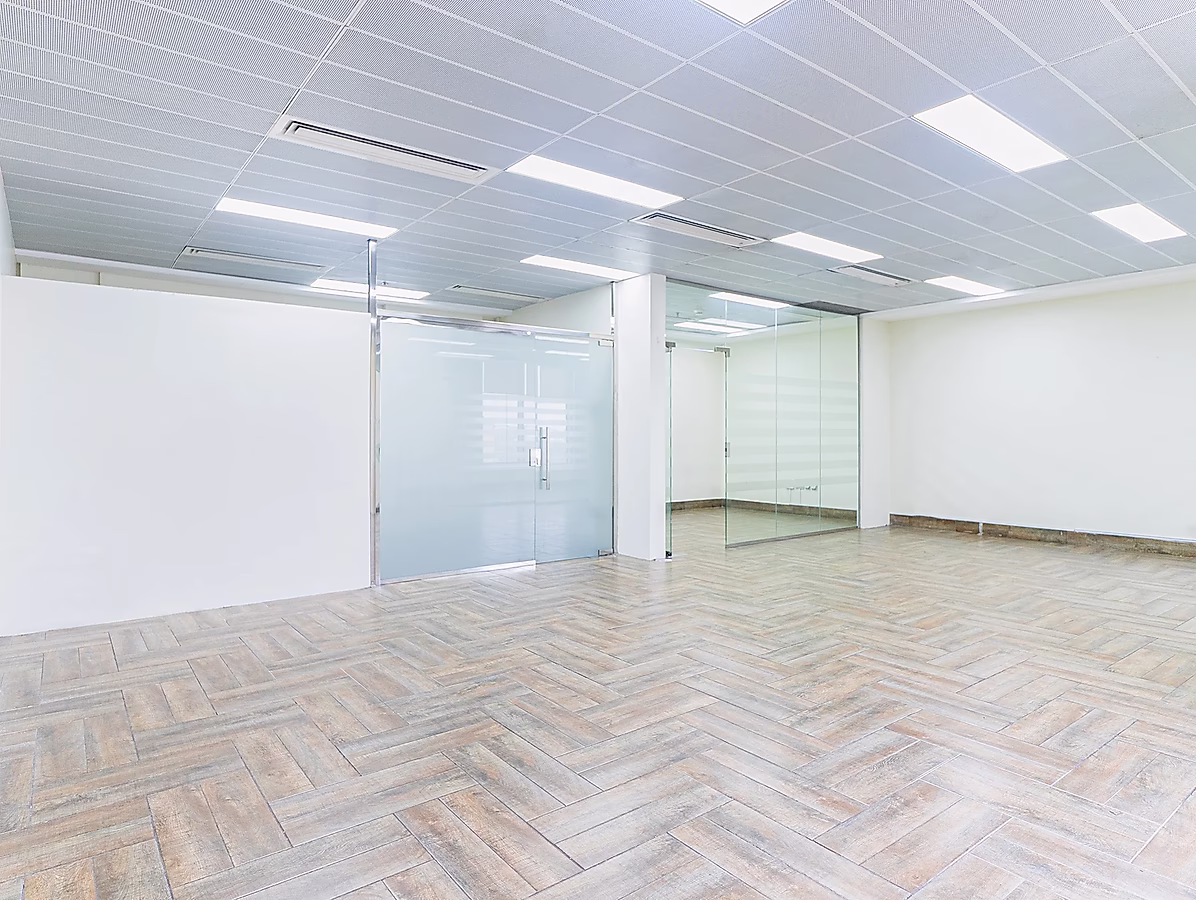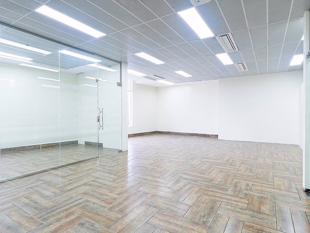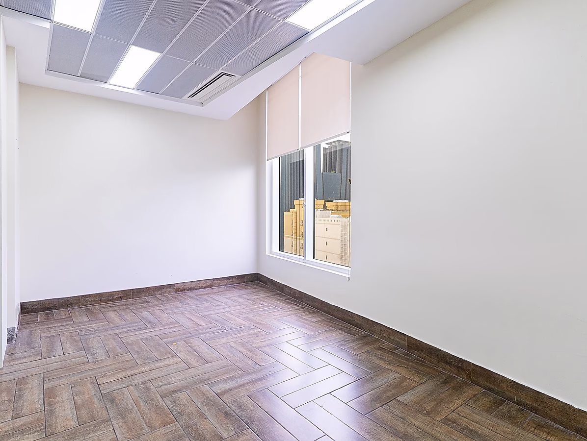 مشرق وجيد التهوية: تسمح النوافذ الكبيرة بالكثير من الضوء الطبيعي لغمر المساحة، مما يخلق جوًا مشرقًا وجذابًا يساعد على الإنتاجية والرفاهية.