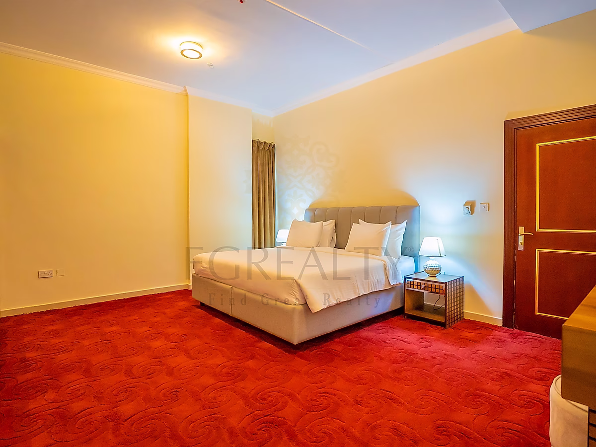 - غرفة نوم مصممة بأناقة مع سجاد فاخر وتجهيزات راقية.