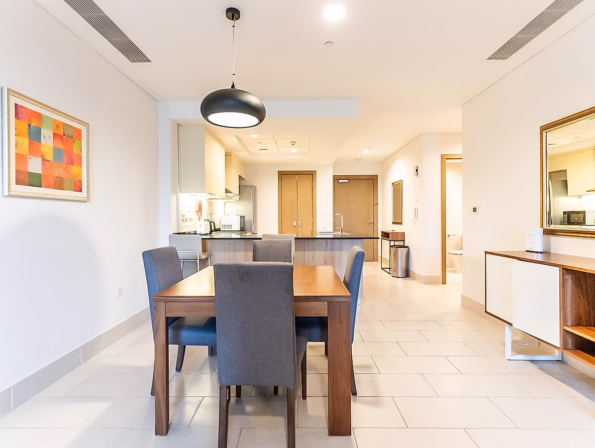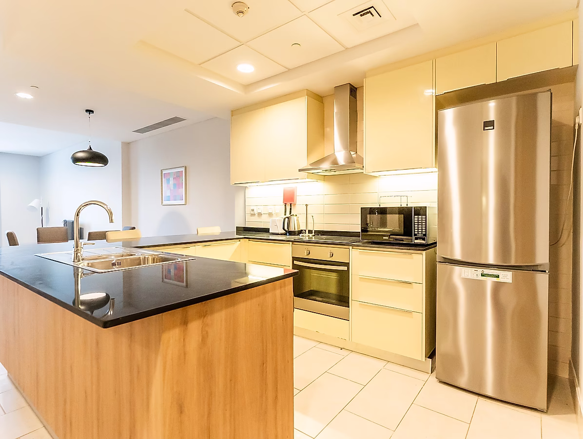تعد منطقة المعيشة الواسعة مثالية للاسترخاء والترفيه، بينما يأتي المطبخ شبه المفتوح مجهزًا بالكامل بأجهزة عالية الجودة، بما في ذلك الثلاجة والفرن والموقد. كما تحتوي غرفة النوم على خزائن مدمجة، مما يوفر مساحة تخزين واسعة.