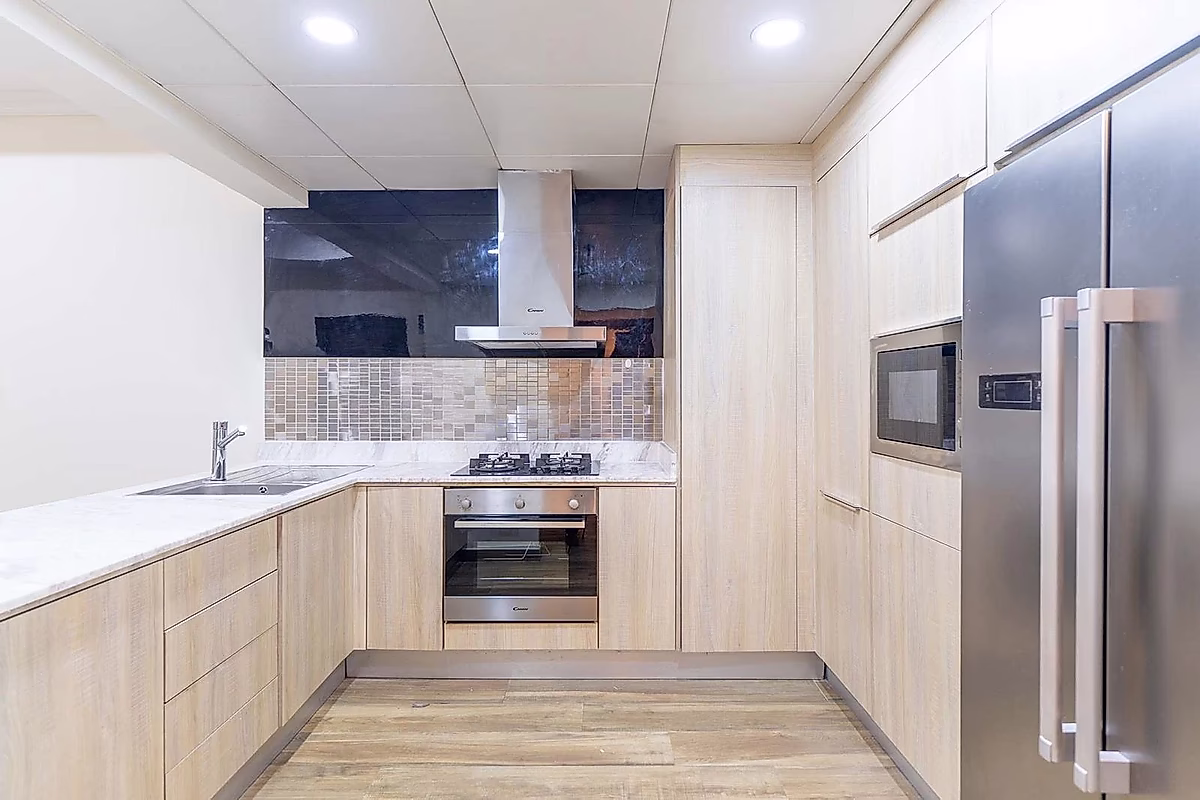 المطبخ مجهز بالأجهزة الأساسية، بما في ذلك الثلاجة، والموقد، والميكروويف. توفر الخزائن الواسعة تخزينًا لجميع احتياجاتك في الطهي، وهناك طاولة طعام صغيرة للوجبات السريعة.