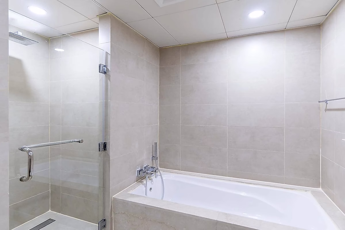 يتميز الحمام الحديث بجمع بين الدش/البانيو، وحوض للغسيل مع مساحة تخزين، وتجهيزات عصرية.