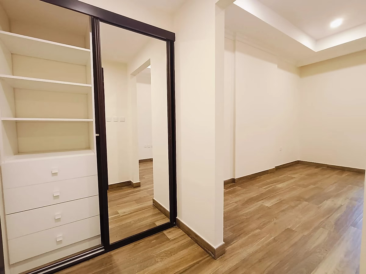 تقدم غرفة النوم الواسعة ملاذًا هادئًا، مع سرير مريح وخزانة لتخزين متعلقاتك. استمتع بالأجواء الهادئة وضوء الشمس الطبيعي الذي يتدفق من النافذة.