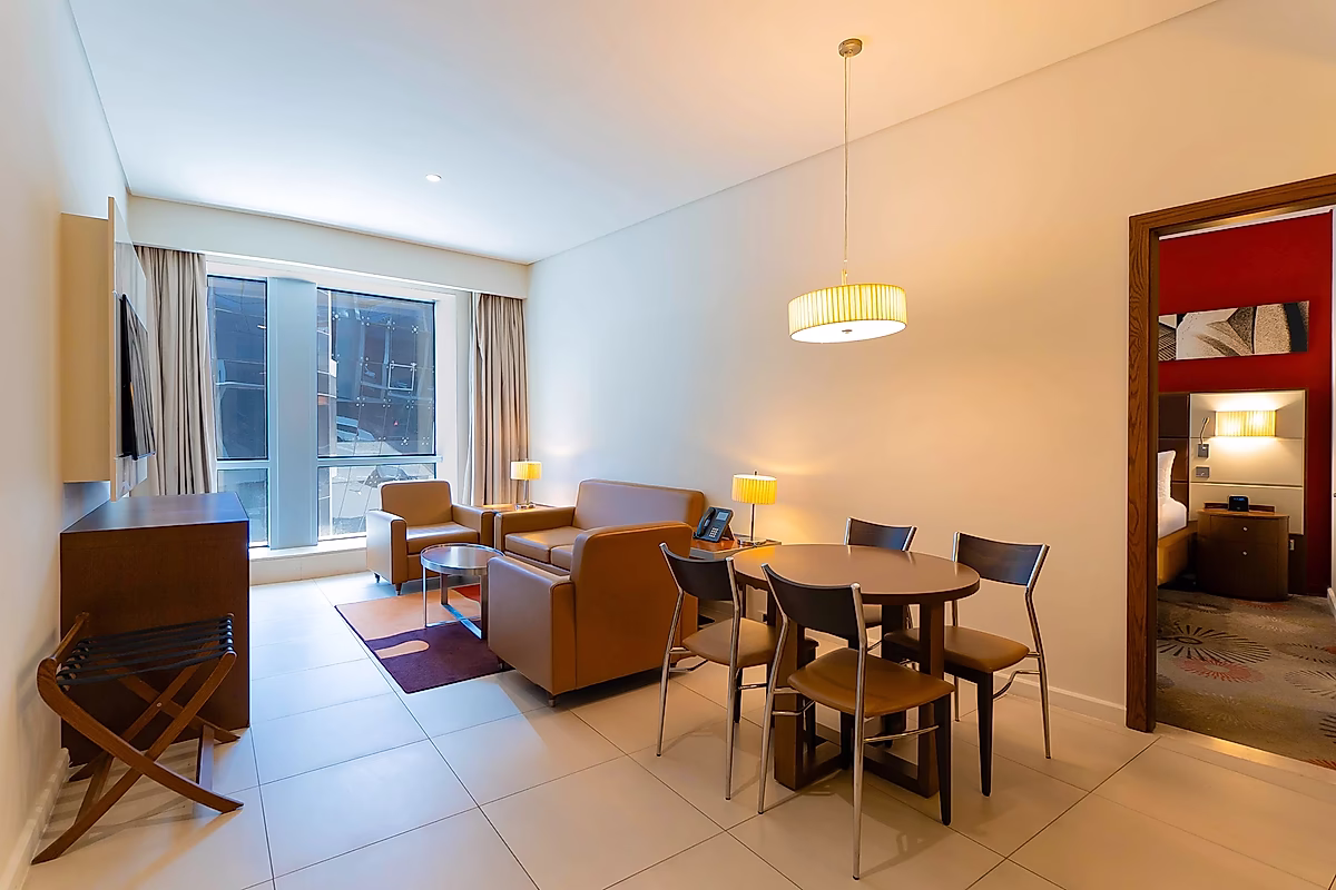 تصميم مفتوح مع غرفة معيشة مريحة ، مثالية للاسترخاء أو الترفيه عن الضيوف. تم تجهيز الشقة بأريكة مريحة وتلفزيون بشاشة مسطحة ومنطقة لتناول الطعام.