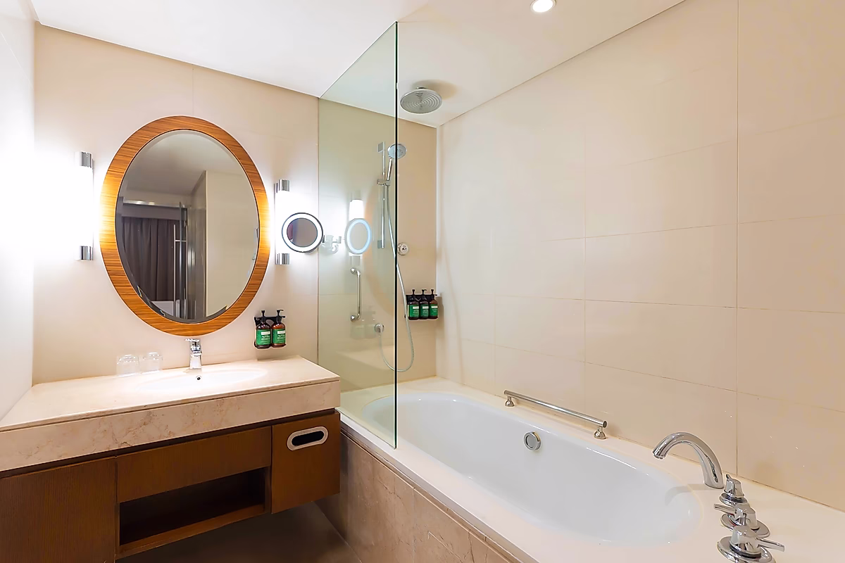 حمام مجهز تجهيزا جيدا يضم تركيبات حديثة ودش مطري ومناشف جديدة.
