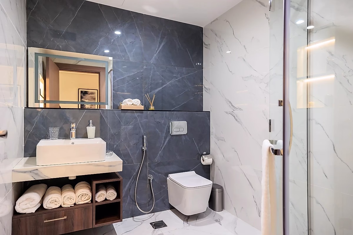 - حمام أنيق مزود بتجهيزات عالية الجودة