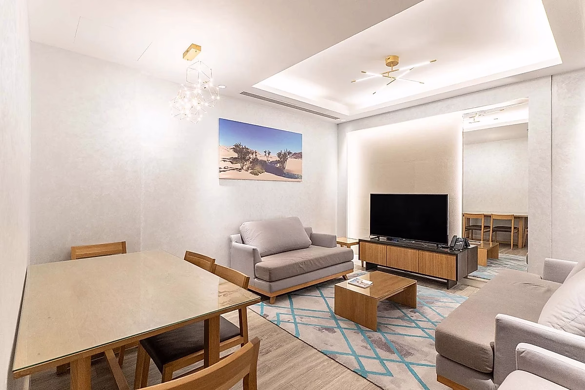 • منطقة المعيشة المعاصرة: تصميم عصري وأنيق يجمع بين الراحة والرفاهية الحديثة.
