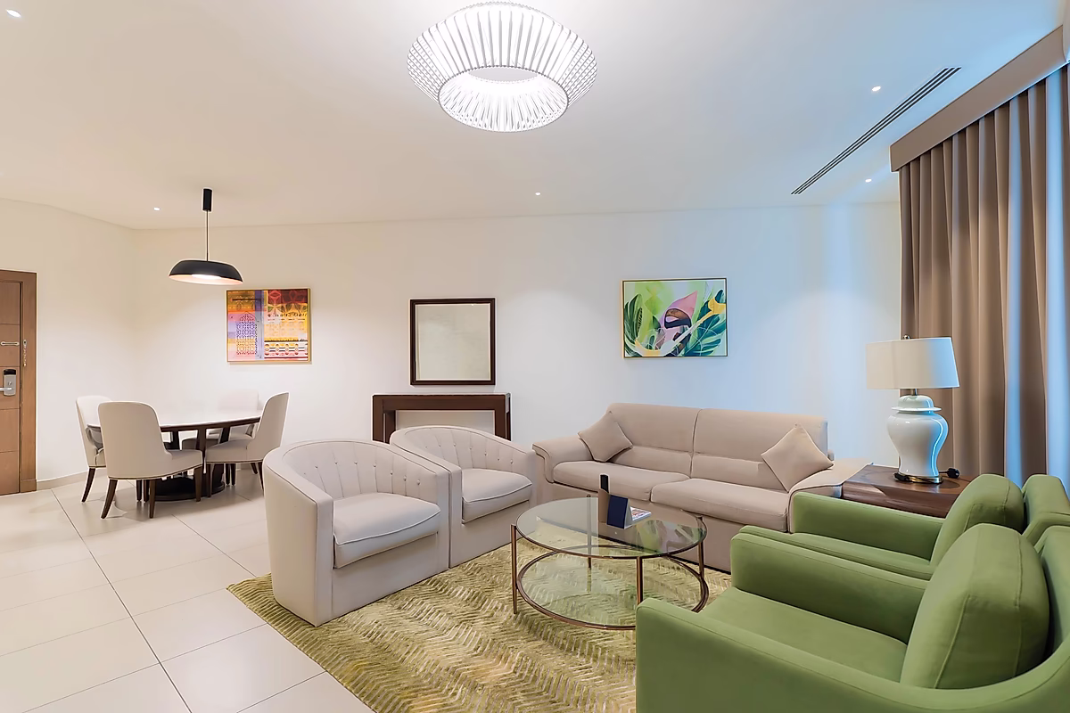 منطقة معيشة واسعة: استمتع بمساحة معيشة مشرقة ومتجددة الهواء ، كاملة مع مفروشات حديثة وأريكة مريحة وتلفزيون بشاشة مسطحة للترفيه.