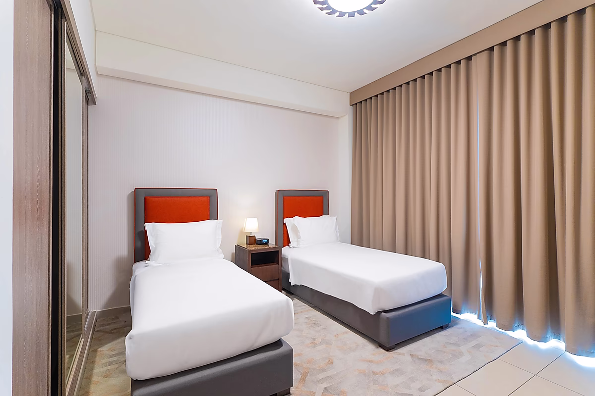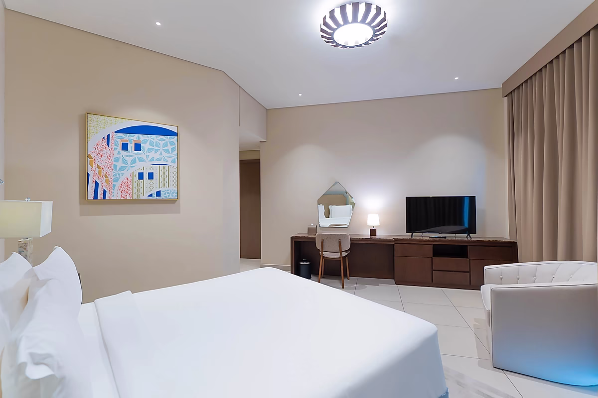 غرفة نوم مريحة: انعم بالاسترخاء في غرفة النوم الهادئة التي تتميز بسرير فخم بحجم كوين ومساحة تخزين واسعة وبياضات أسرة ناعمة لضمان نوم مريح ليلا.