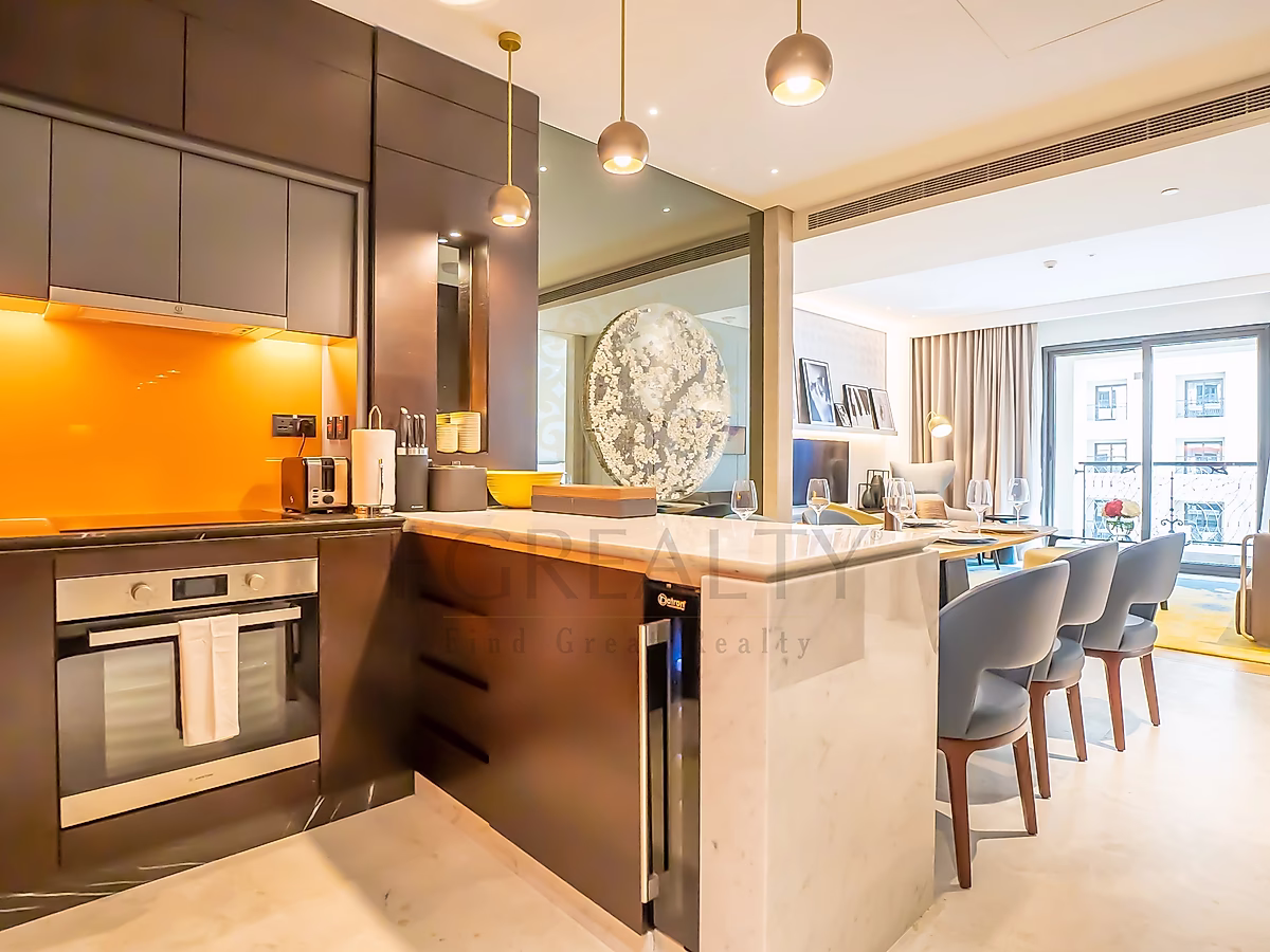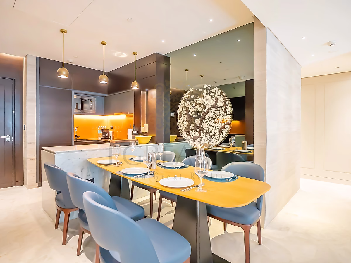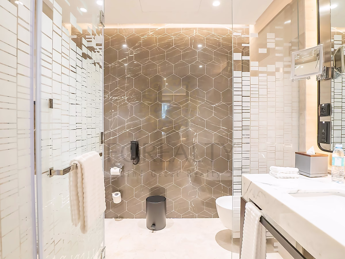 تضم الشقة مطبخًا مفتوحًا، ومنطقة معيشة وطعام مؤثثة بأناقة، ونوافذ ممتدة من الأرض حتى السقف تسمح بدخول ضوء طبيعي وفير. استمتع بإطلالات خلابة على المدينة من الشرفات الخاصة — واحدة في غرفة المعيشة وأخرى في غرفة النوم الرئيسية.