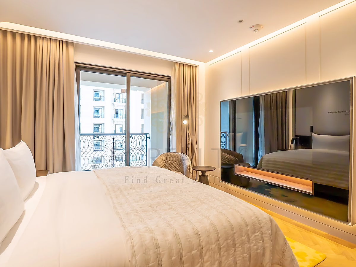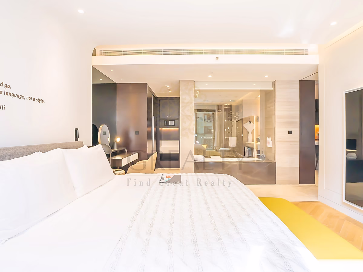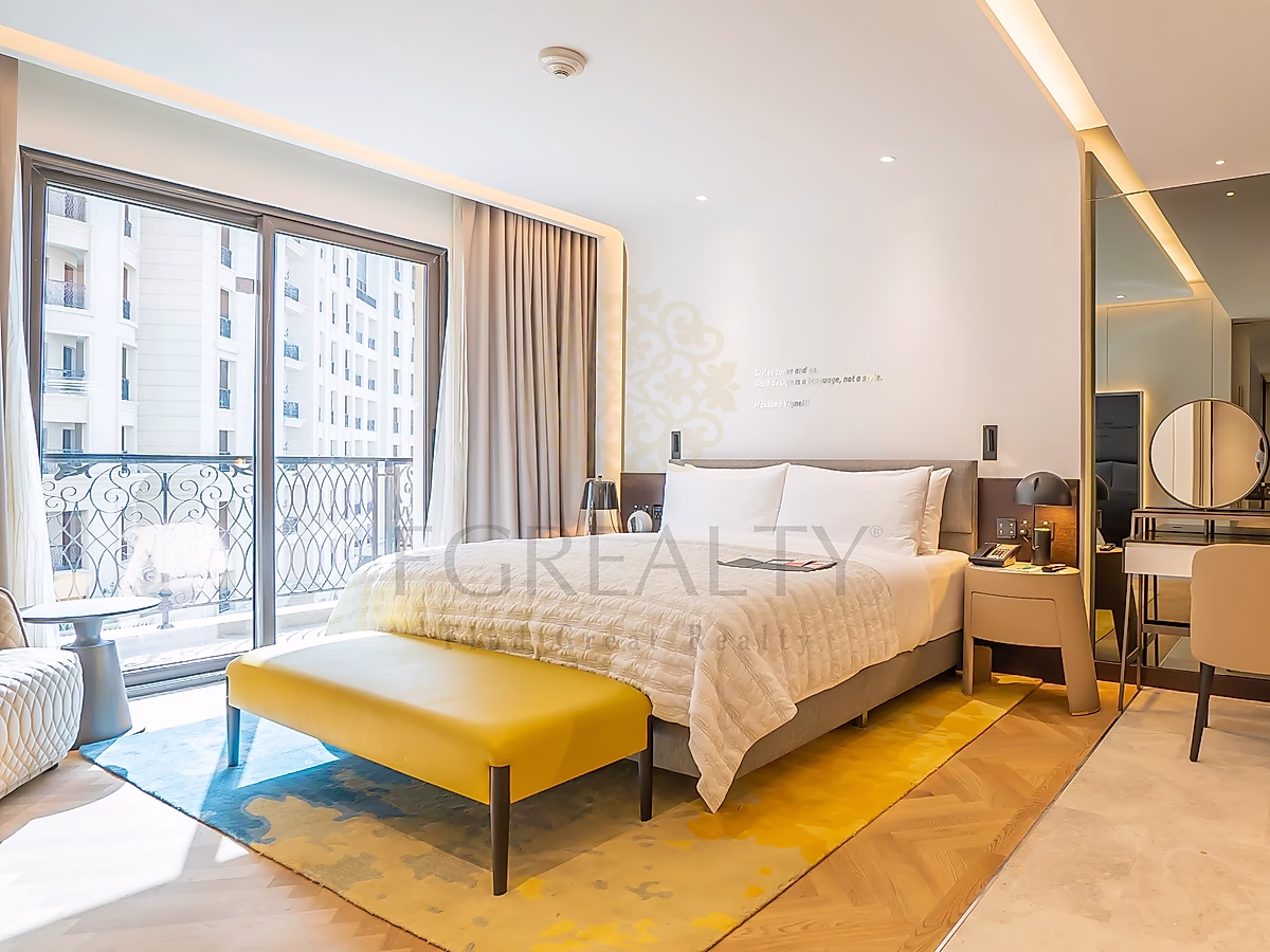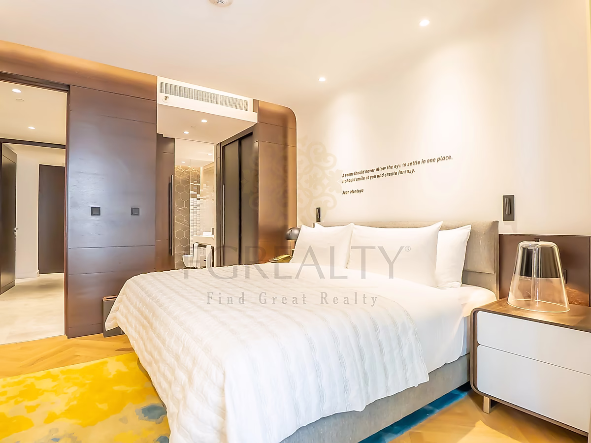 تضم الشقة مطبخًا مفتوحًا، ومنطقة معيشة وطعام مؤثثة بأناقة، ونوافذ ممتدة من الأرض حتى السقف تسمح بدخول ضوء طبيعي وفير. استمتع بإطلالات خلابة على المدينة من الشرفات الخاصة — واحدة في غرفة المعيشة وأخرى في غرفة النوم الرئيسية.