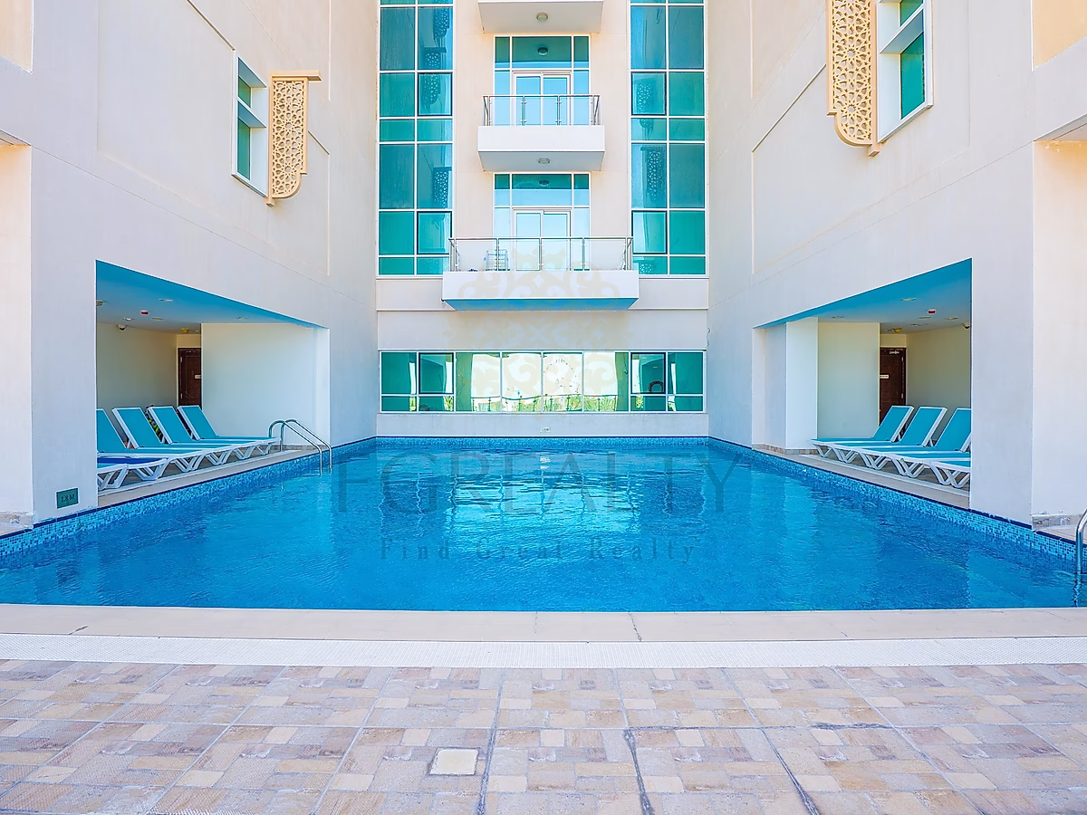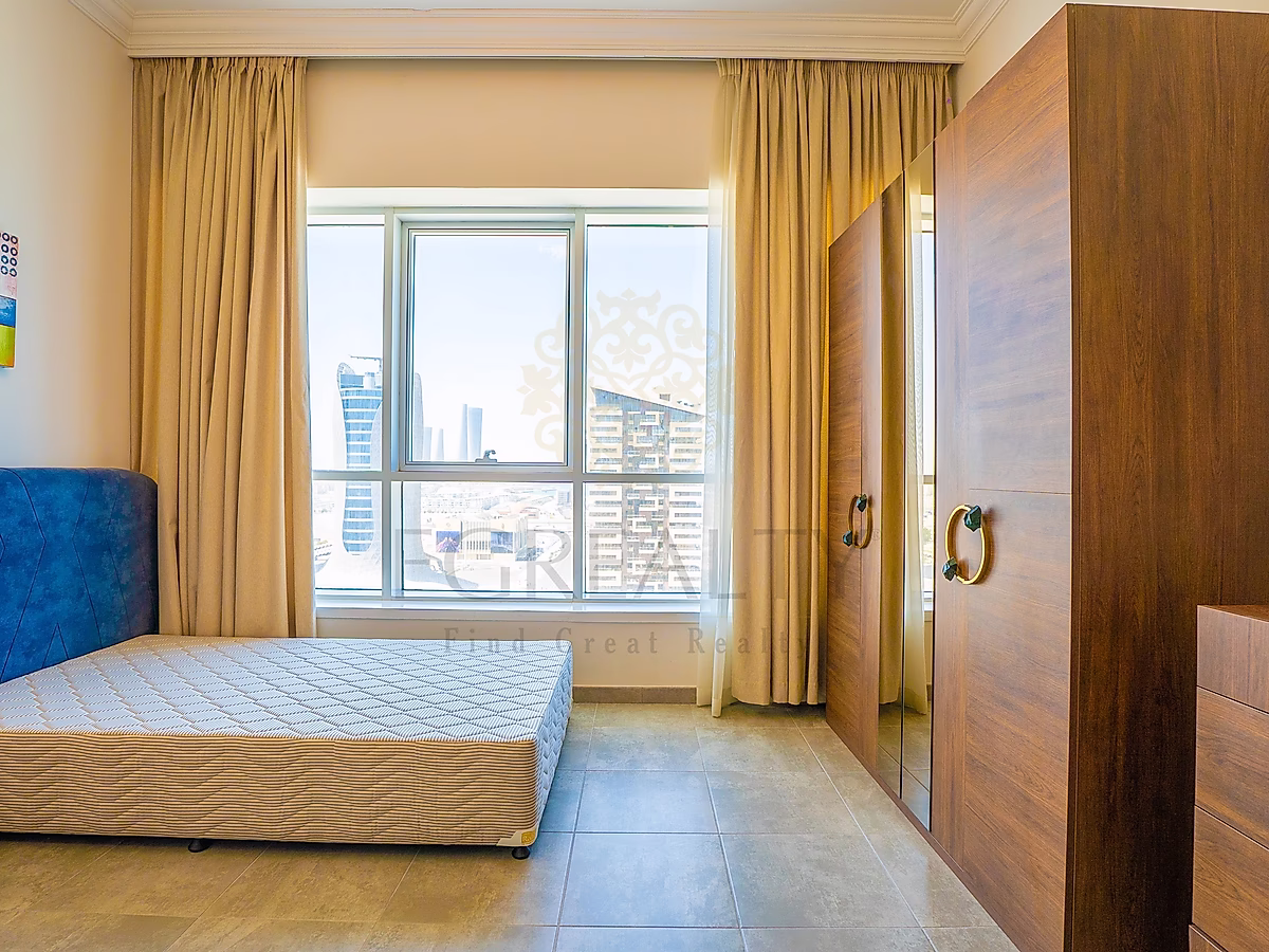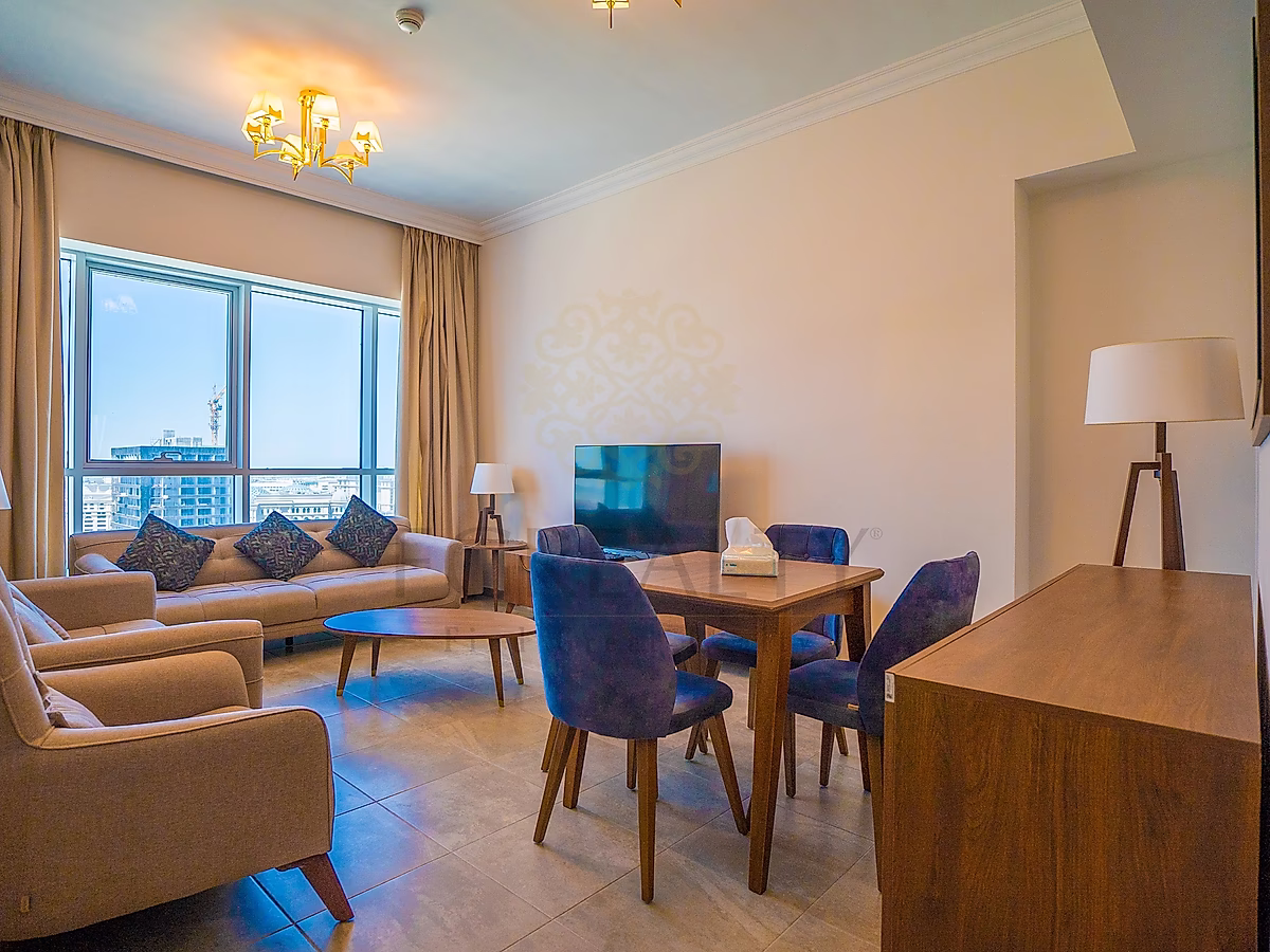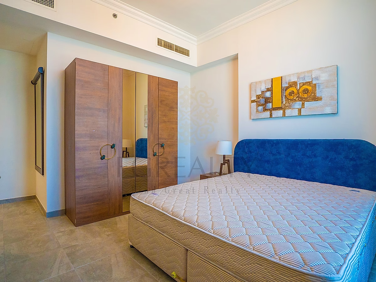 مميزات الشقة: مفروشة بالكامل صالة واسعة وغرفة طعام غرفة نوم بسرير ملكي وحمام ملحق بها غرفة نوم بسرير توأم حمام مشترك