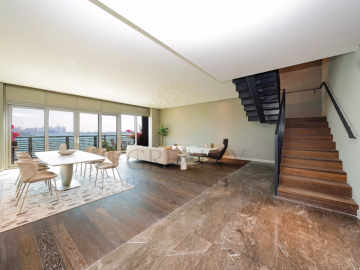 منطقة المعيشة والطعام صُممت لتكون قلب المنزل، وتفتح مباشرة على شرفة مطلة على البحر، حيث تمتد الإطلالة بلا عوائق وتتحول المساحة إلى مكان مثالي للاستمتاع بالهواء والضوء الطبيعي.