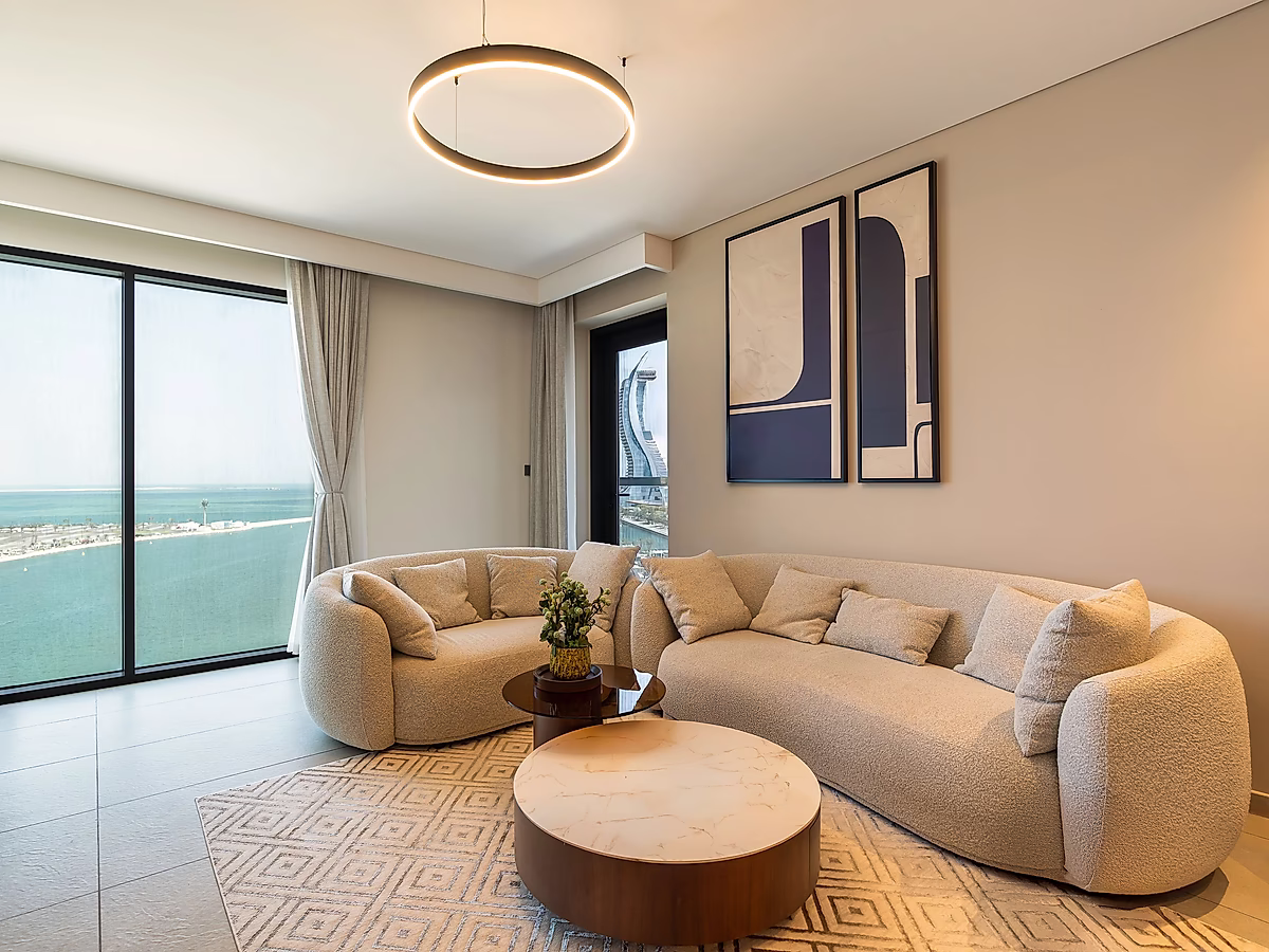 غرف معيشة واسعة ومفتوحة مع نوافذ من الأرض حتى السقف توفر إطلالة بانورامية على البحر.