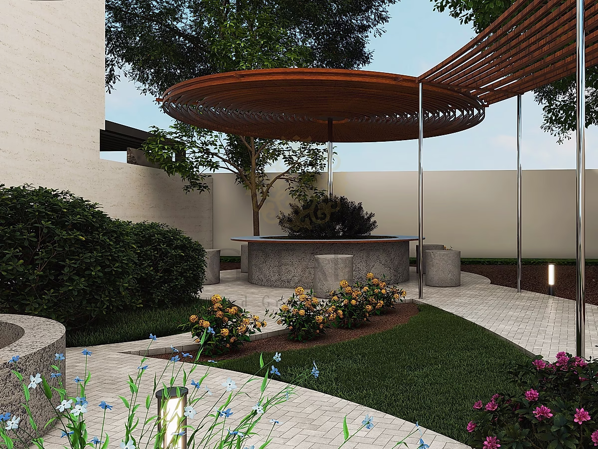 حدائق خلفية مجهزة بالكامل مع مشواة، وشلال، وفناء، وبرجولا