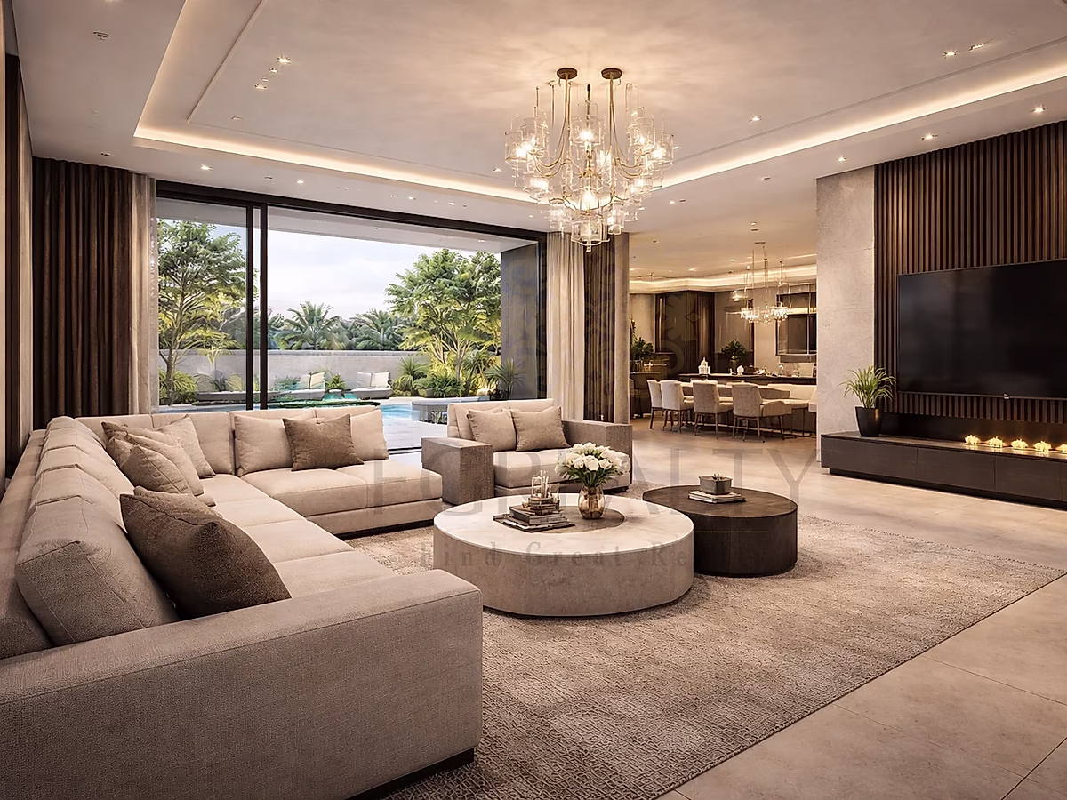 تضم الفيلا ٥ غرف نوم واسعة مصممة بعناية لضمان الراحة والخصوصية، بالإضافة إلى مساحات معيشة وطعام مفتوحة تنسجم مع الطابع العصري للتصميم. الخطوط المعمارية النظيفة والواجهات الواسعة تعزز الشعور بالانفتاح مع الحفاظ على العملية في الاستخدام اليومي.