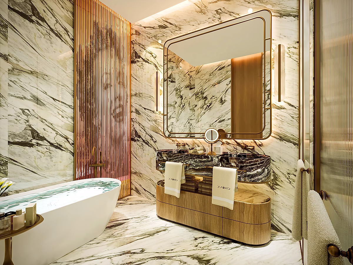Luxury Amenities: Spa, indoor pool, gym, entertainment terraces, private club