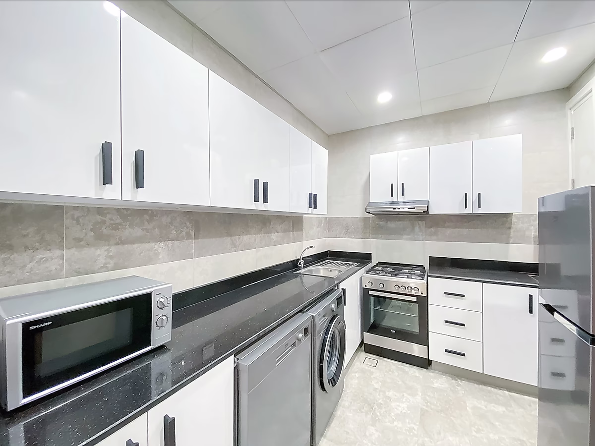 Modern Kitchen: Equipped with built-in appliances, sleek cabinetry, and ample storage.