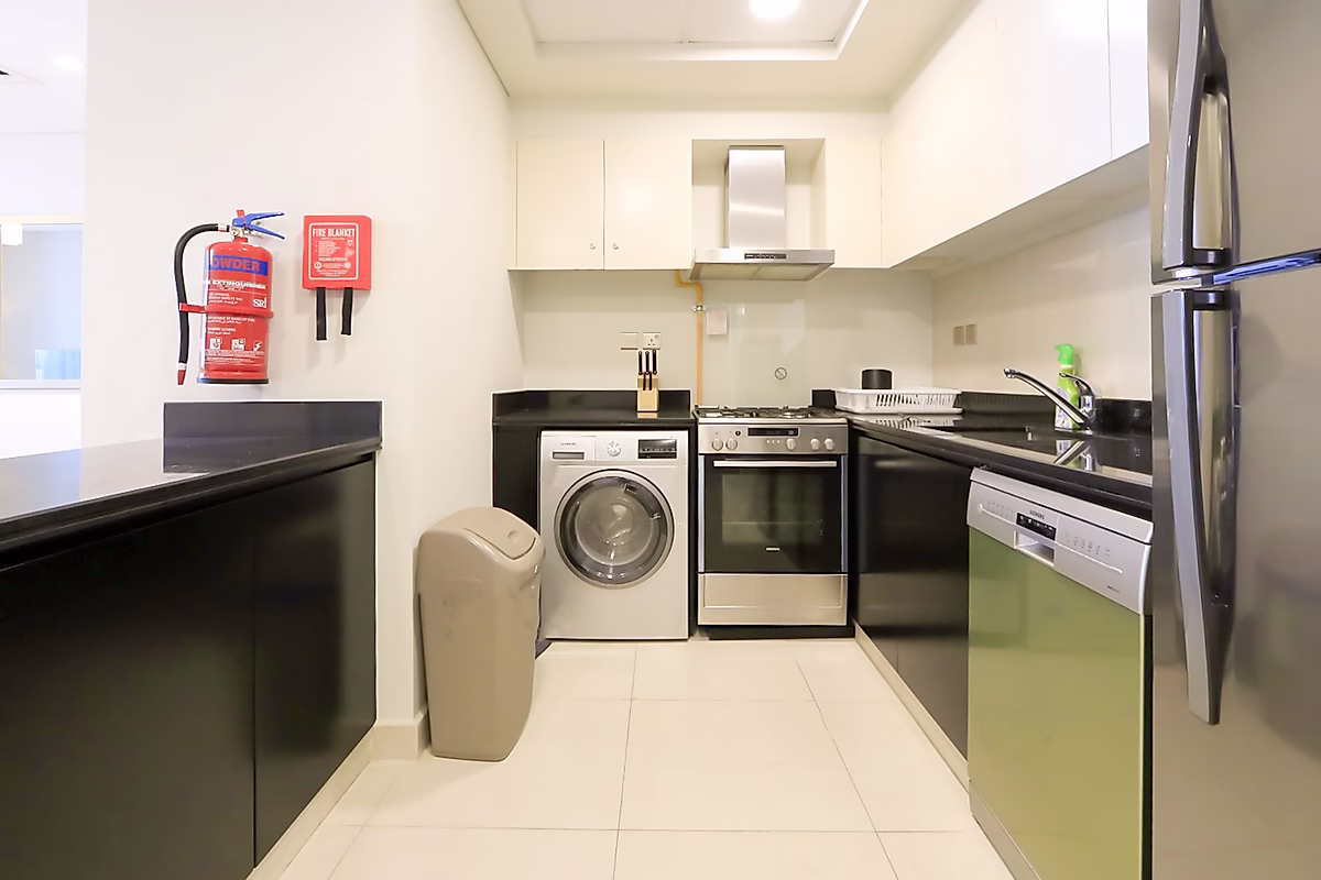 The spacious living and dining area is tastefully decorated with cozy furniture and elegant finishes—perfect for relaxing or entertaining guests. The open kitchen comes fully equipped with everything you need to cook your favorite meals right at home.
