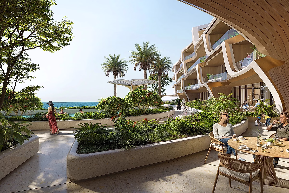 700m Promenade: Yoga gardens, infinity pools, shaded cabanas, and social spaces.