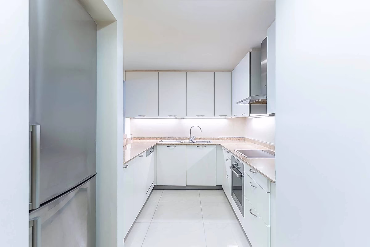 The apartment features a guest toilet, adding to the convenience of hosting visitors. The closed kitchen is fully equipped with modern appliances and ample storage, ideal for those who love to cook and entertain.