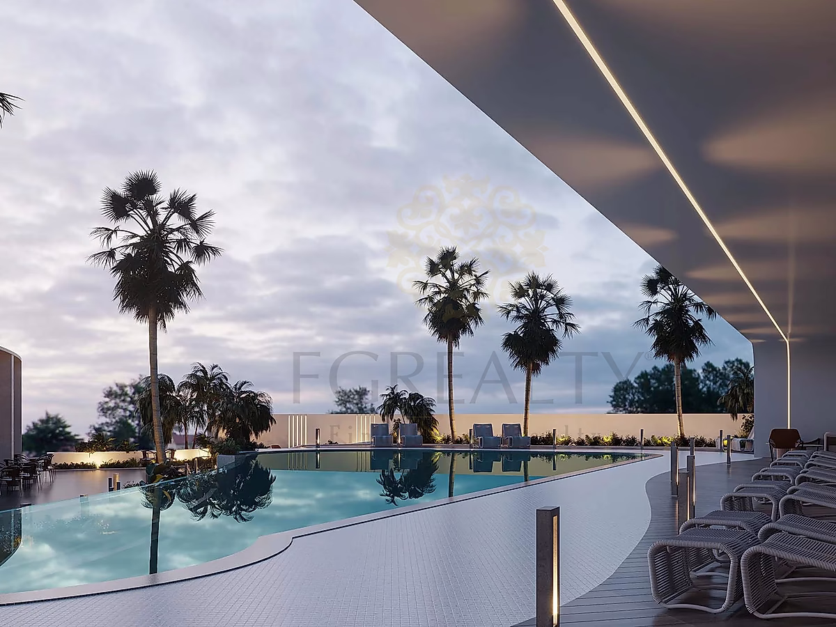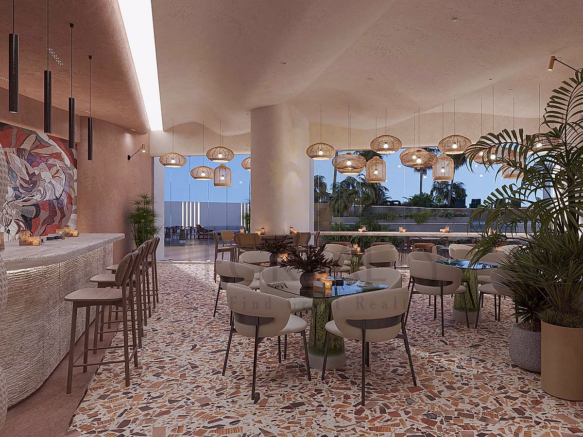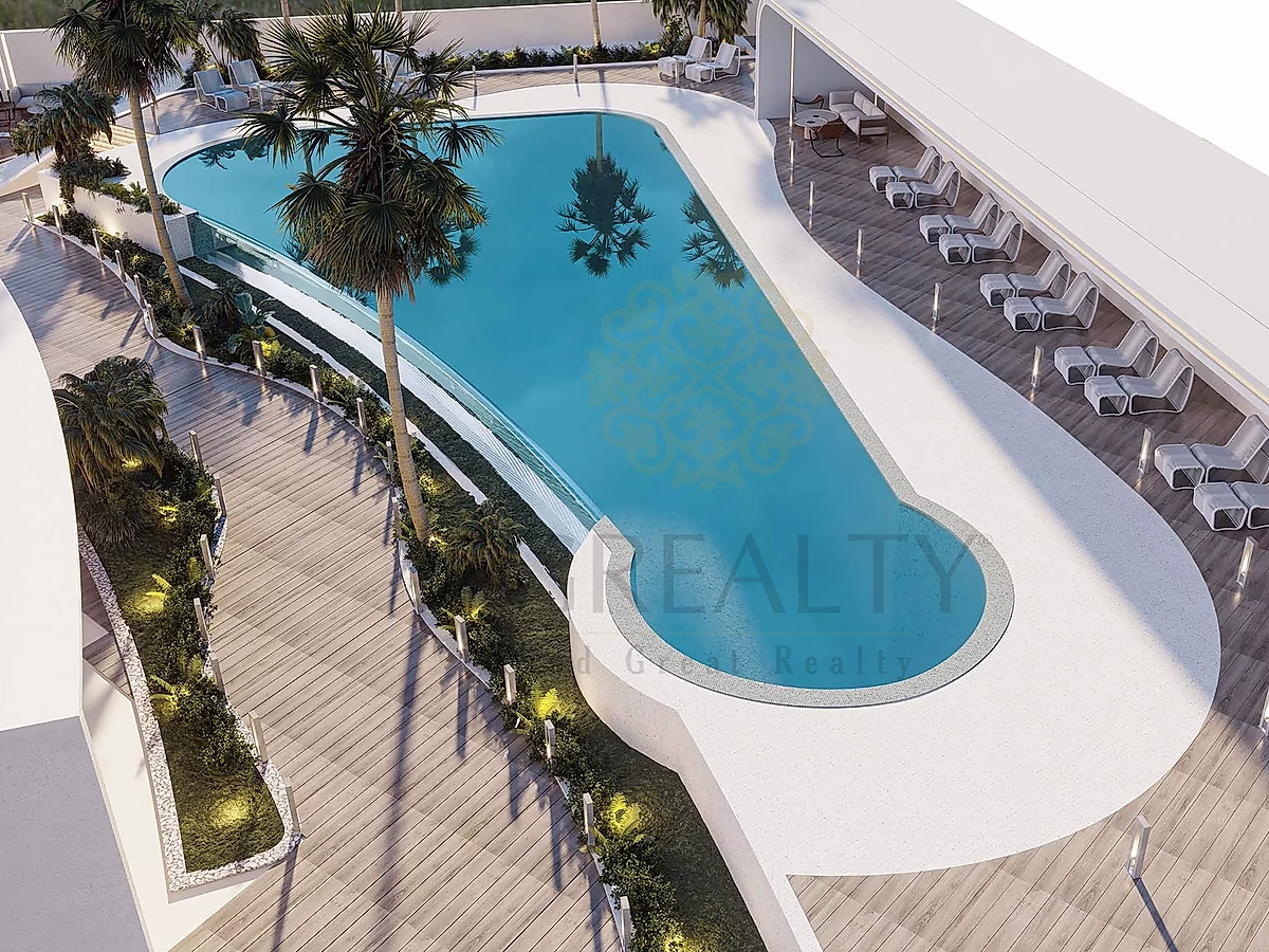 Iconic curved architecture inspired by the sea, flowing balconies, open communal spaces, private gardens, and terraces. 119 semi-furnished units with fully equipped kitchens, en-suite bathrooms, living/dining areas, and dressing rooms.