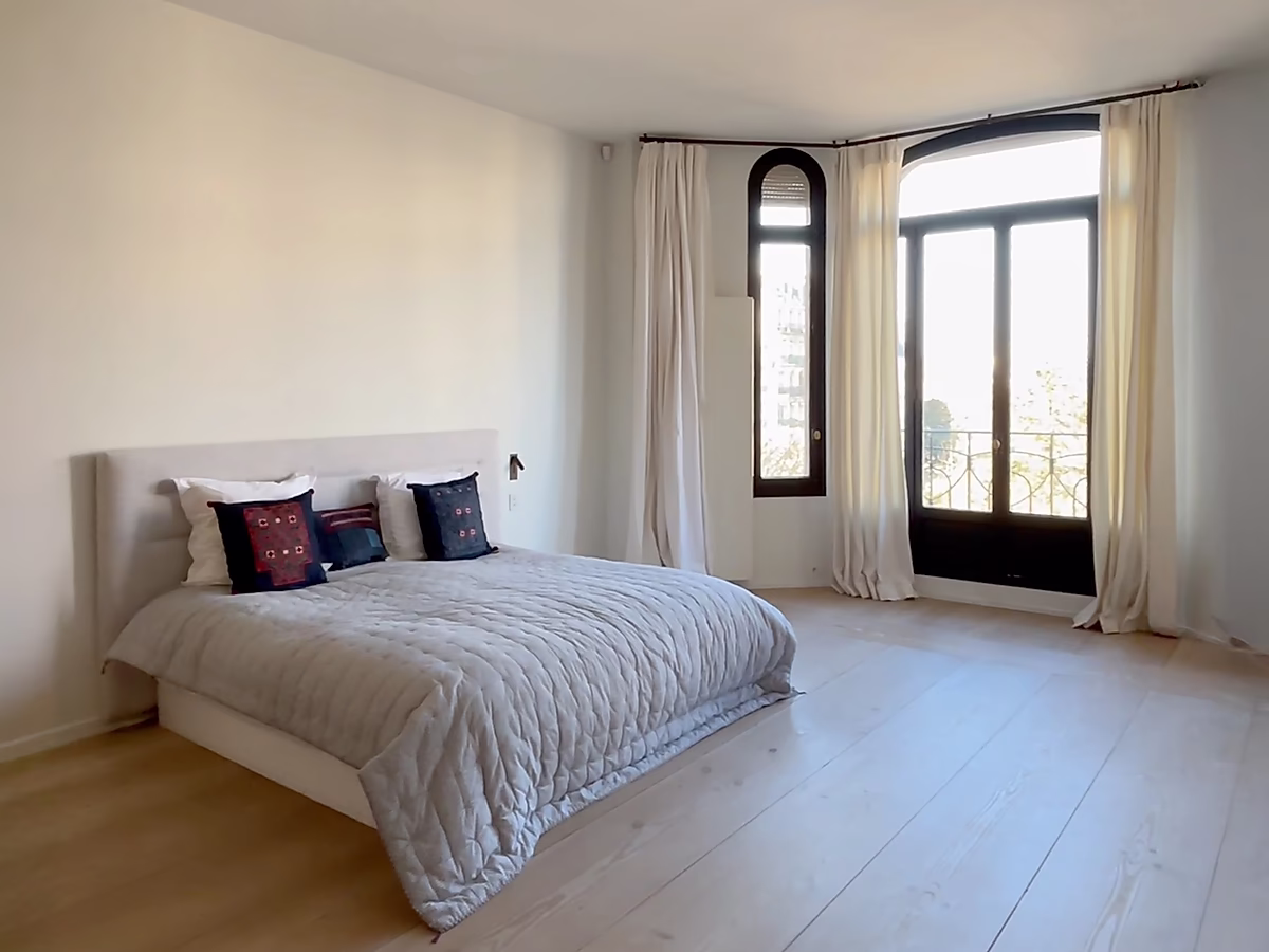 Upon entering, you're welcomed by a stately entrance hall that opens into a vast 60 sqm reception room with a period fireplace, offering a refined setting for both entertaining and everyday living. The space is bathed in natural light through large windows and benefits from soaring 3.60-meter ceilings, emphasizing the apartment’s generous proportions.