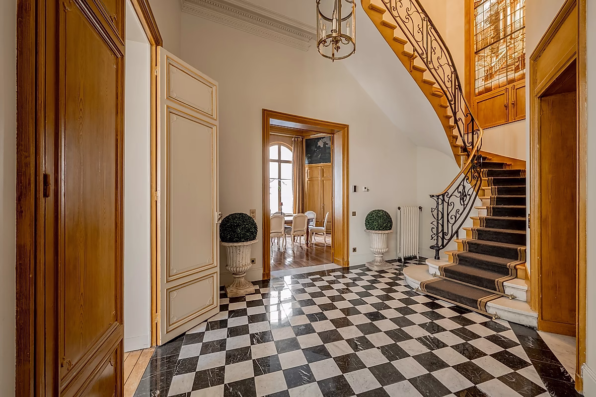 Located just steps from the renowned Invalides, this 19th-century private mansion offers an unparalleled blend of history and modern luxury. Spanning 700 m², the property features a grand 400 m² main living space with ceilings soaring over 4 meters high, creating an atmosphere of grandeur and elegance. An antique staircase, adorned with a signature stained-glass window and gilded details, serves as the heart of this stunning residence, evoking both classical charm and artistry.