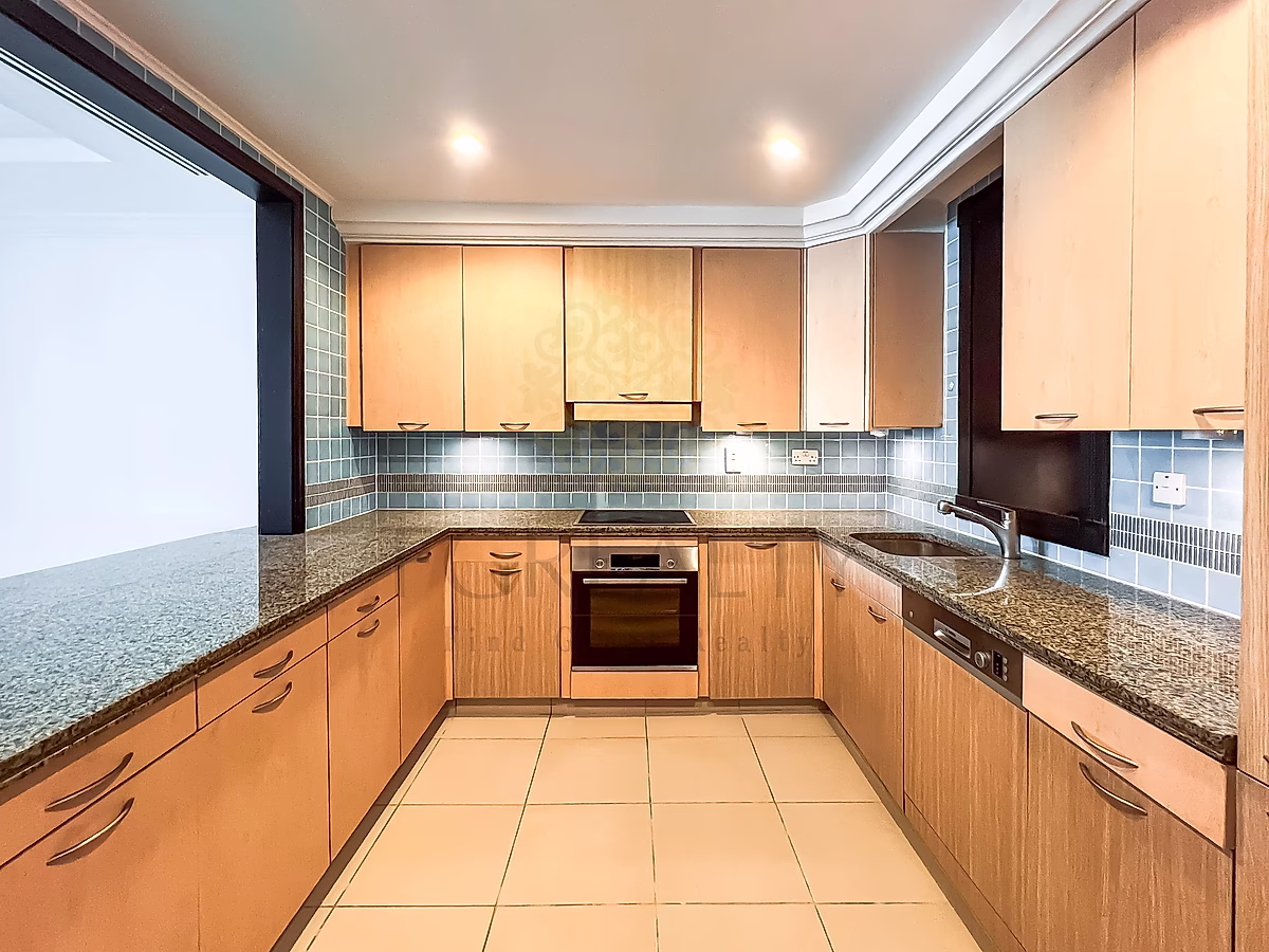 A lovely two-bedroom townhouse overlooks a marina in Porto Arabia. It has a spacious living and dining area, a closed kitchen, and a guest toilet, as well as a nice terrace with views of the marina bay walk.